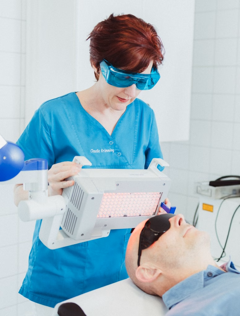- Belichtung: Die Haut wird mit einer speziellen Lichtquelle (rotes Licht) bestrahlt. Dabei entstehen reaktive Sauerstoffmoleküle, die gezielt die geschädigten Zellen zerstören.